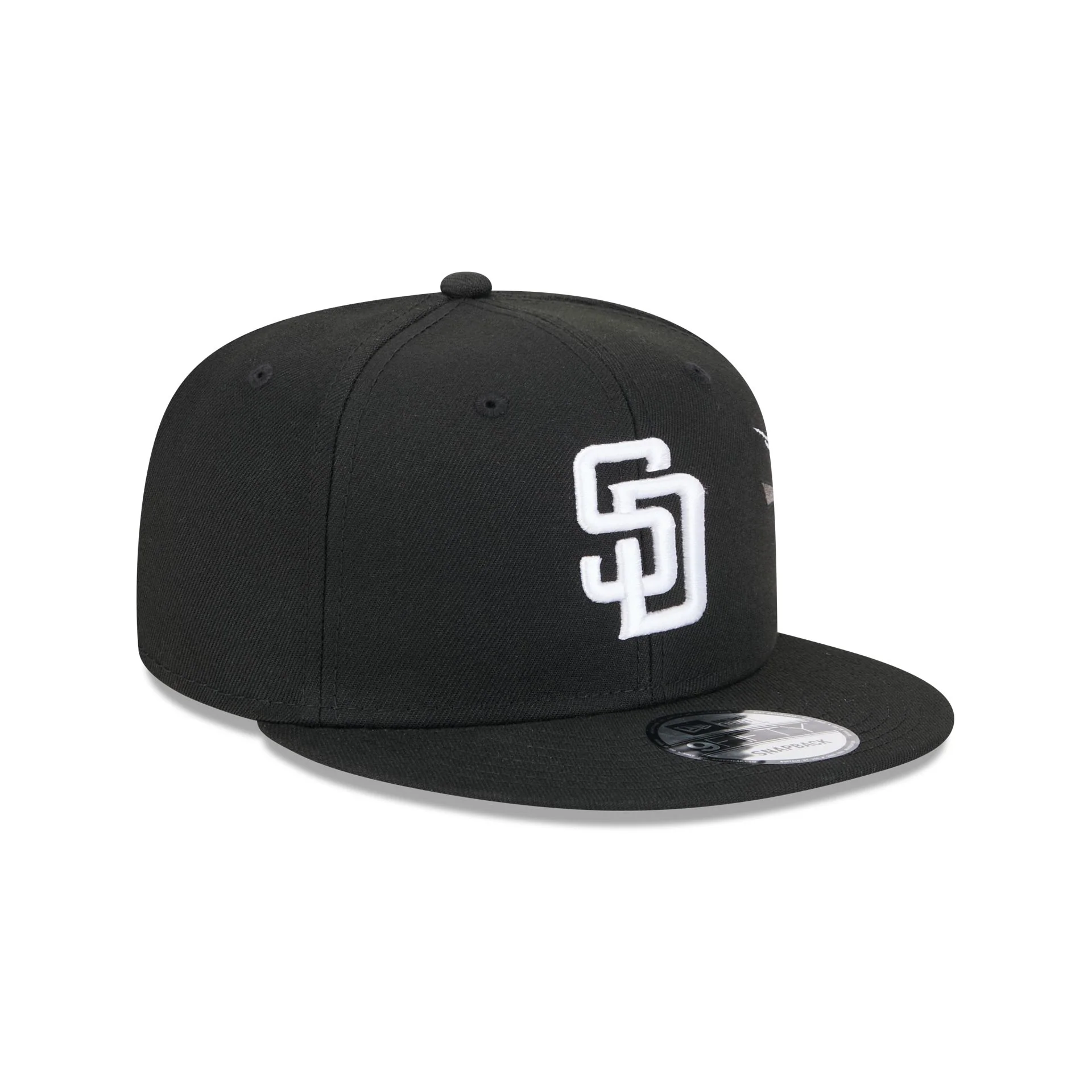 The San Diego Padres City Art 9FIFTY Snapback features an embroidered Padres black and white logo at the front panels and an embroidered city banner with art at the right-wear side. Additional details include a snapback closure at the rear and a gray undervisor.