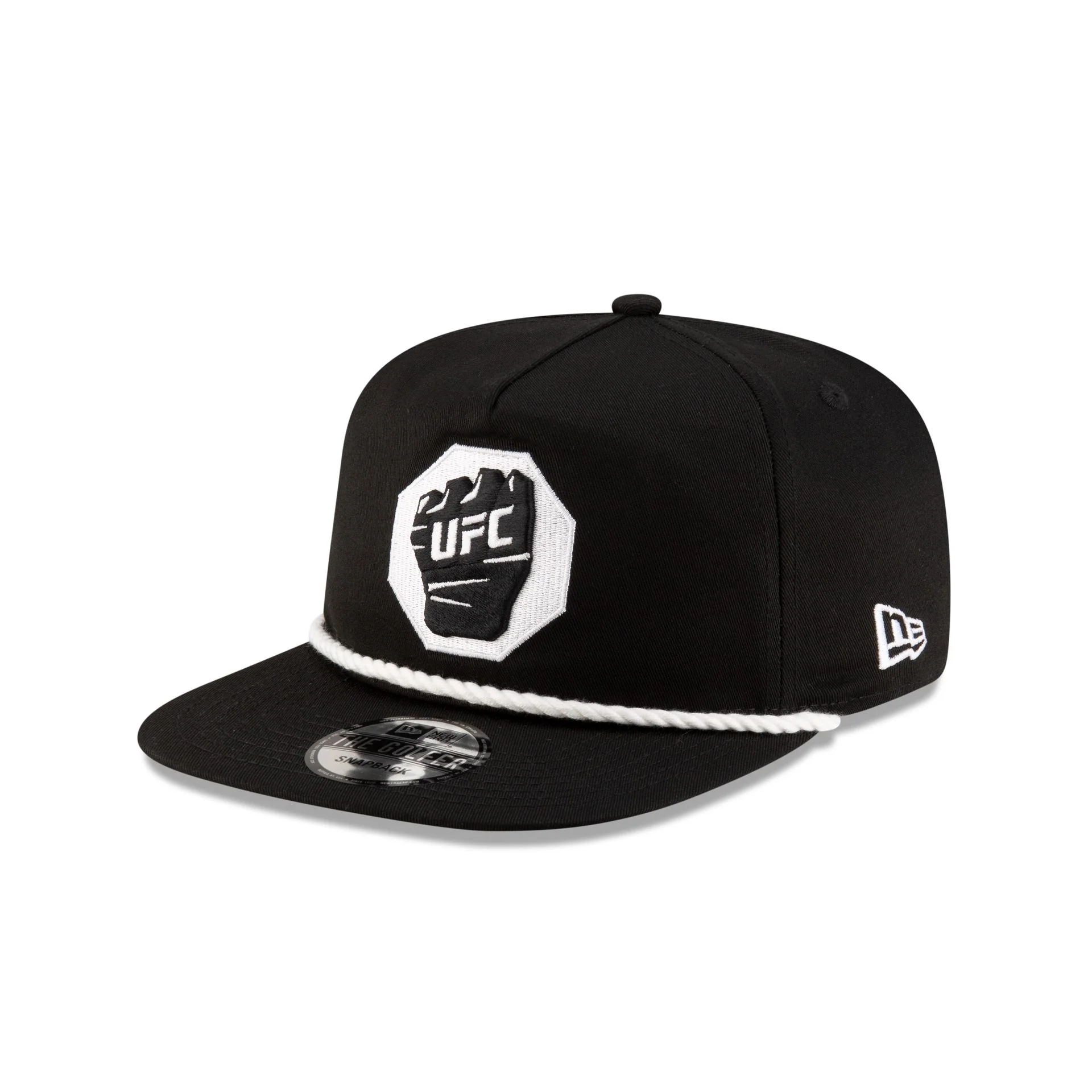 The UFC Mexico Black Glove Golfer Hat features an embroidered UFC glove logo at the front panels with the Mexican flag patch at the right-wear side. Additional details include a rope at the base of the crown and a snapback closure at the rear.