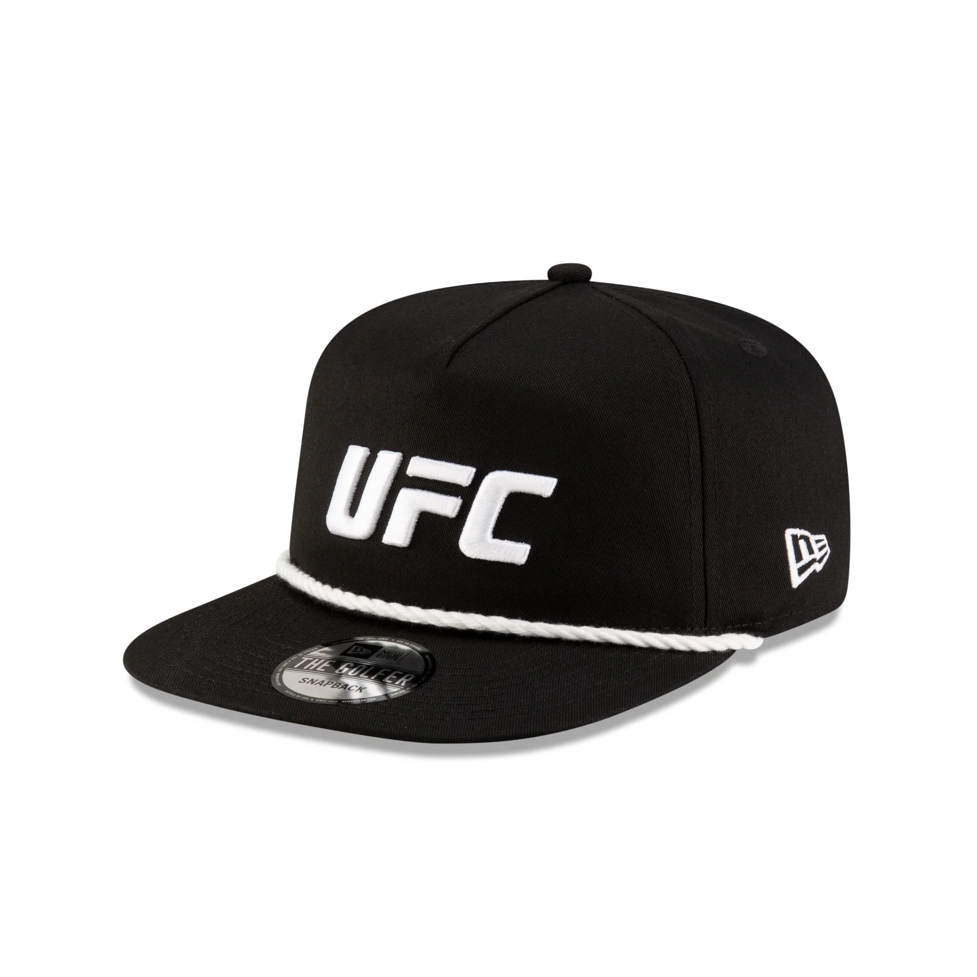 The UFC Mexico Black Golfer Hat features an embroidered UFC logo at the front panels with a Mexican flag patch at the right-wear side. Additional details include a rope at the base of the crown and a snapback closure at the rear.